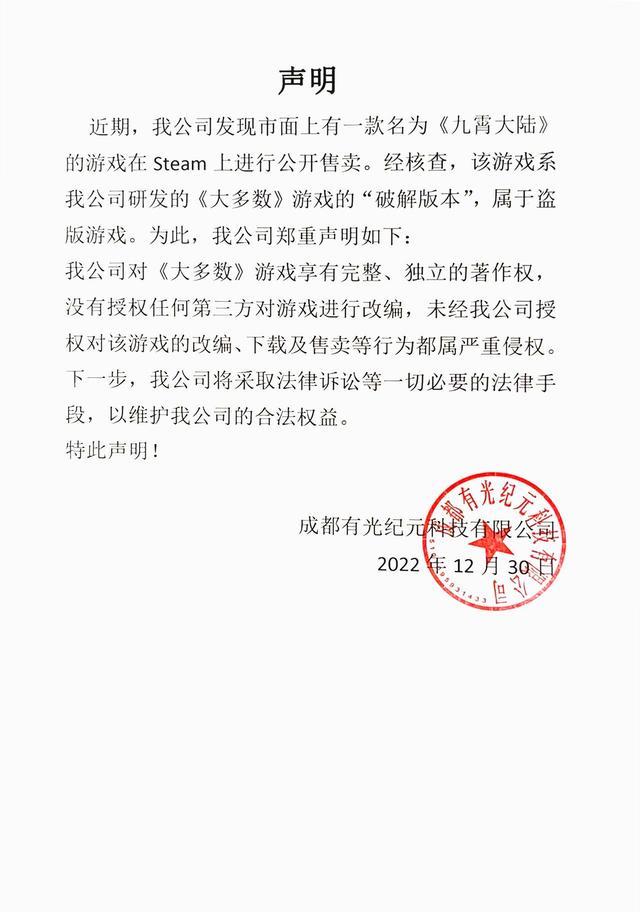 IT之家 12 月 30 日消息,不久前推出的国产“打工人”模拟开云(中国)官方《大多数》发布声明,称近期在 Steam 售卖的《九霄大陆》盗取《大多数》包体和商店素材,并已经联系 Steam 官方举证其盗版行为,要求做下架处理,还将采 ...
